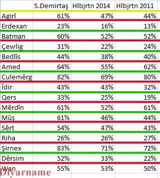 Di hilbijartina 2011, 2014 û di hilbijartina Serokomariya Tirkiyeyê de vê tevgerê li bajarên kurdan, li bajarên ku yan yekemîn yan duyemîn de sedî çend deng girt?