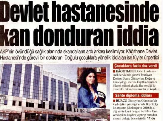 Rojnameya Yurt li ser Nexweşxaneya Dewletê ya Kagithaneya Stenbolê nûçeyek çêkir û di nûçeyê de got ku dixtoreke pratisyen bi navê Dr. Burcu Gursoy bi taybetî dermanê ku dozaja wê zêdeye daye zarokên ji bajarên rojava û başûrêrojava (yanê zarokên kurdan).