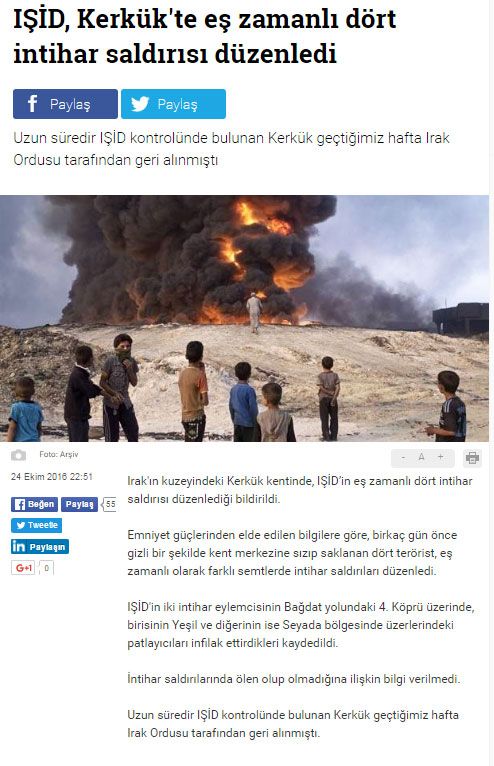 T24 malpereke muxalif e. Divê mirov heqê wan nexwe ku malperek serketiye jî û gelek agahiyên li ser kurdan bi awayekî rast diweşîne jî. Ev hemû li aliyek, lê emê nûçeya wan a îro bigirin dest. Nûçe bi sernavê "DAIŞ'ê li Kerkukê li heman demê çar êrîşên întîxarî pêkanîn" (24.10.2016, saet 22.51) hatiye weşandin.