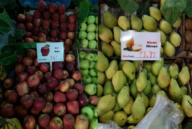 Li Amedê mêwefiroşekî etîketên ku buhaya mêweyan nîşan dide bi kurmancî û kirmanckî (zazakî) nivîsandine. Sêv-Seye, Hirmî-Miroye û mînakên din... Wî mêwefiroşî bi vê kirina xwe dilê me fetih kir. Em sipasiya wî dikin û pêşniyara her kesî dikin ku ji cihên etîketên bi kurdî ne tiştên xwe bikirin.