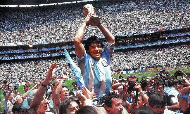 Maradona di sala 1986'an de Kûpaya Dinyayê li ser navê Arjantînê bi dest xist. Di fînalê de Arjantînê Almanyaya Rojava bi 3-2 têk bir û kûpa bir mala xwe. Maradona jî ji ber serketina wî bi Xelata Goga Zêrîn hat xelatkirin. Di vê tûrnûvayê de meseleya ku li dinyayê bû navdar di çarîk fînalê de gola ku avêtibû Îngilistanê bû. Di maçê de Maradona du gol avêtin û yek jê bi dest avêtibû ku ev mesele wekî "Destê Xwedê" ket nav dîroka fûtboyê ya dinyayê. Gola din jî balkêş bû ji ber ku Maradona 60 metre gog digindirand, gelek lîstikvan li dû hiştin û gol avêt. Ev gola Maradona di sala 2002'yan de ji aliyê FIFA'yê ve wekî "Gola Sedsalê" hat hilbijartin. Arjantînê Îngilistan di vê maçê de bi 2-1 têk bir.