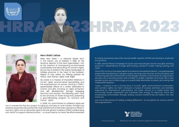 Navenda Mafê Mirovan a Cenevreyê her sal roja 10’ê berfanbarê ku di heman demê de Roja Mafê Mirovan a Dinyayê xelatan belav dike. Bi vê yekê sazî piştgirî dide jinên di vî warî de xebatê dikin. Çalakvan Hêro Wekîl Cafer jî di vê çarçoveyê de xelat girt. Hêro Wekîl Cafer di sala 1986'an de li Helebçeyê hatiye dinê. Ev bi salan e li ser mafên mirovan dixebite. Di radyoya Dengê Nwe de xebitiye. Dîsa ji bo penaberên kurdên Rojava li Başûr kar kiriye. Li ser jinan, mafên war, mafên mirovan semîner dane, xebat kiriye. Xebata wê ya dawî li ser ji nû ve bikaranîna avê û ji bo elektrîkçêkirina ji rojê sazkirina xaniyeke model bû.