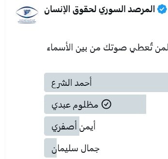 Rewangeha Sûrî ya Mafê Mirovan ji bo Sûriyeyê li ser mafên mirovan dixebite. Vê saziyê niha li ser hesabê xwe anketeke balkêş bi zimanê erebî belavkiriye. Ev Anket ji vê pirsê pêk tê: